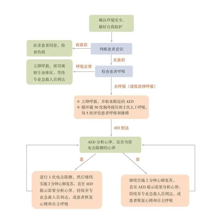 电击除颤:如果AED建议除颤,需要再次确认所有人员均未接触患者(接触者可能被电击)。待AED充电完成后,按下“电击”按钮放电(半自动AED)或AED自动放电除颤。