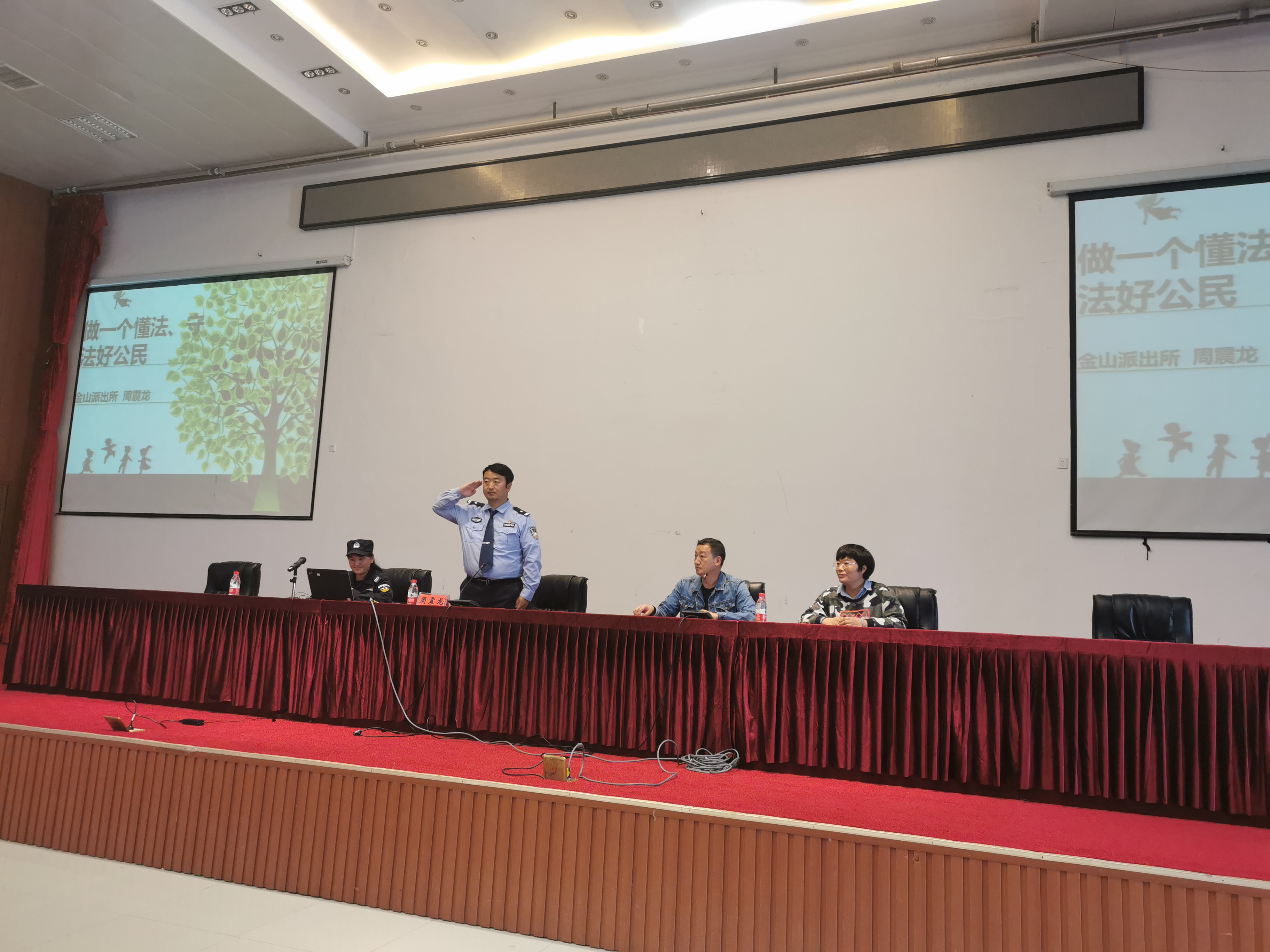 金山派出所副所长周正龙为大家现场讲授《做一名懂法、守法的好公民》的专题法治讲座
