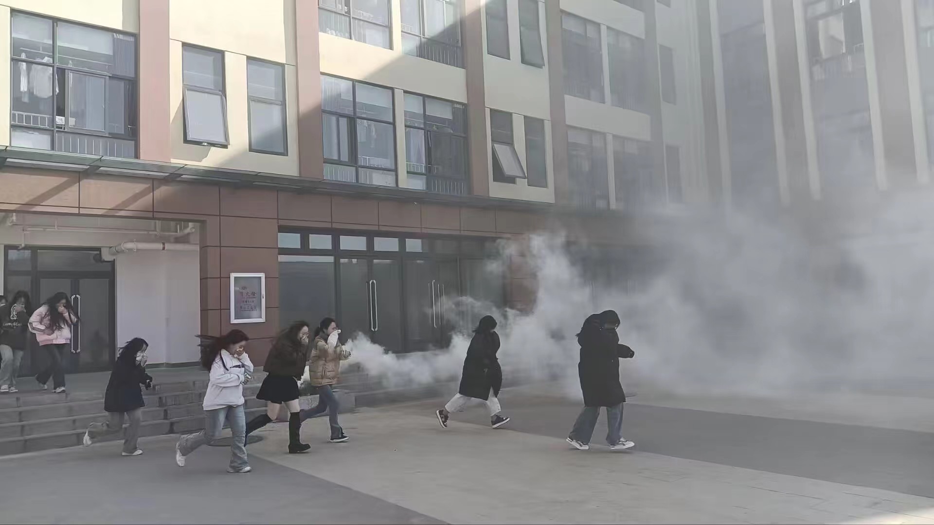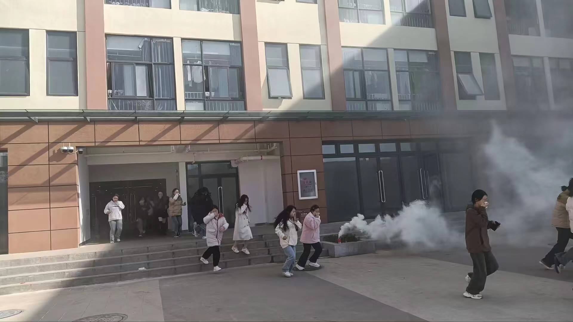 经学校前期的精心组织,周密安排,消防广播一响,烟雾弹点燃,各楼层负责老师组织学生进行疏散工作。全体师生沉着冷静、互相合作,一切行动听从指挥,按照学校制定的应急方案,圆满完成了此次紧急疏散活动。